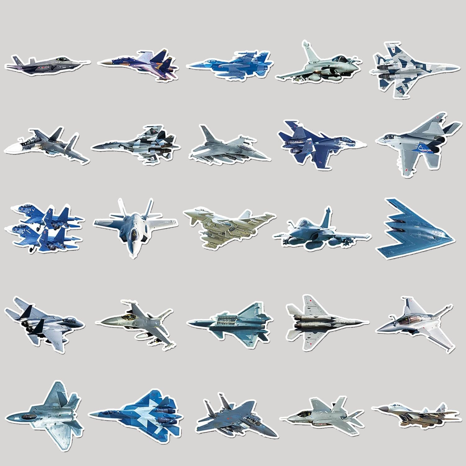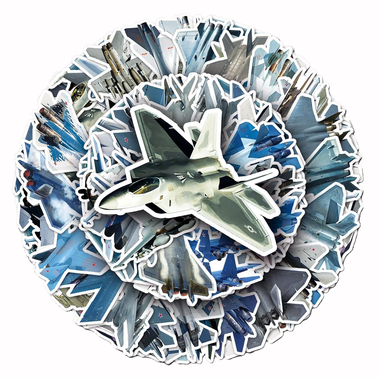 Set mit 50 farbigen Aufklebern von Militärflugzeugen.