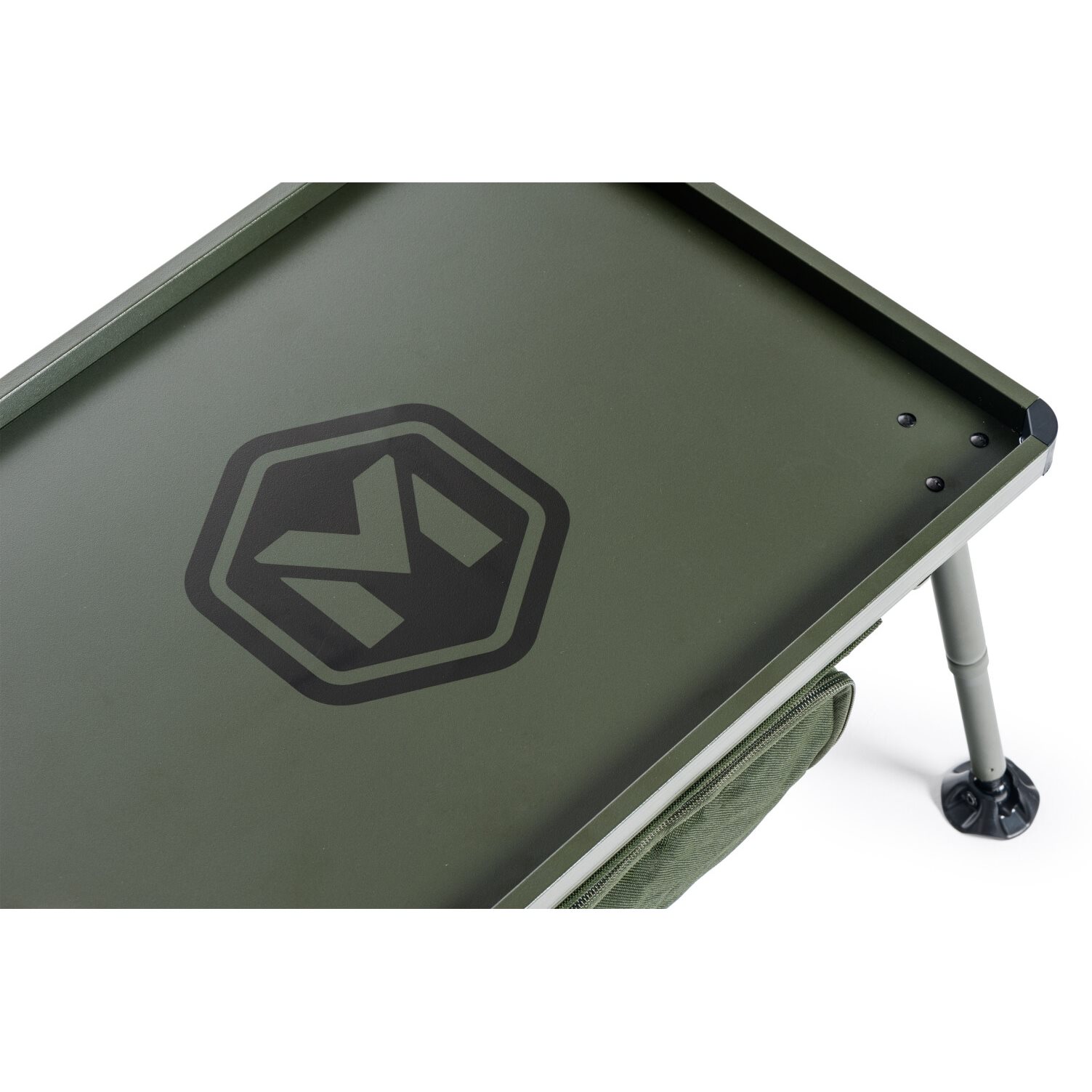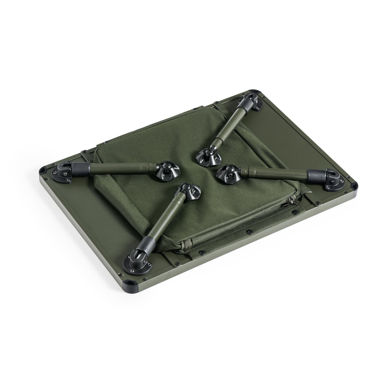 Neu entwickelter, größerer Bivak-Tisch mit Stauraum unter der Tischplatte. Der Stauraum ist mit einem Reißverschluss verschließbar und sein Boden ist mit einer leichten, aber ausreichend stabilen Platte verstärkt. Die vollständig aus Metall gefertigte Konstruktion der Hauptplatte garantiert Stabilität und eine lange Lebensdauer. Die Teleskopbeine sind mit hochwertigen Schwenkfüßen und einem Schnellverriegelungssystem ausgestattet. Sie ermöglichen es, den Tisch in einer überdurchschnittlichen Höhe aufzustellen. Das Ausklappen und Einklappen der Beine ist ebenfalls sehr einfach. Der Tisch wird in einer praktischen Transporttasche mit Tragegriffen geliefert.
