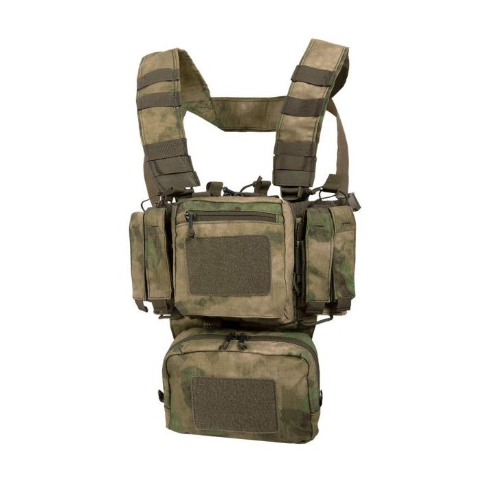 Das Tragesystem besteht aus H-förmigen Schultergurten und einem einfachen Hüftgurt. Die Schultergurte sind breit, unpolsteriert und an der Vorderseite mit mehreren Schlaufen zum Befestigen kleiner Taschen oder zum Durchführen von Schläuchen für ein Trinksystem oder eine Funkantenne ausgestattet. Auf der Rückseite befindet sich ein Panel mit einem Klettverschluss (13,5 x 6 cm) für Patches. Alle Gurte sind längenverstellbar und können dank Fastex-Schnallen komplett getrennt werden, um das Chest Rig an einer ballistischen Weste oder Plattenträger zu befestigen.