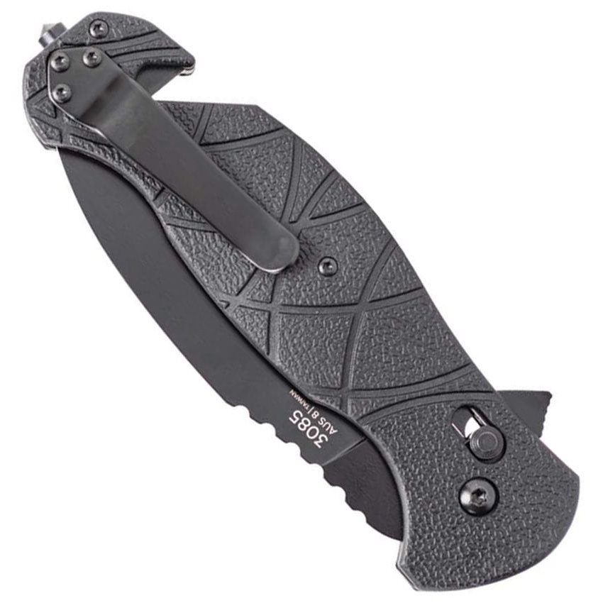 EDC-Messer mit mehreren Elementen von Rettungsmessern. Die Klinge mit glatter Schneide und Drop-Point-Form ist aus AUS-8-Edelstahl gefertigt und für ein einfacheres Öffnen mit einem Flipper ausgestattet. Im geöffneten Zustand wird die Klinge durch eine Crossbar-Lock-Sicherung arretiert. Der Griff mit rutschfester Struktur besteht aus GRN, einem mit Glasfaser verstärkten Nylon. Der Griff ist mit einem Gurtschneider, einem Glasschneider und einem Taschenclip ausgestattet.