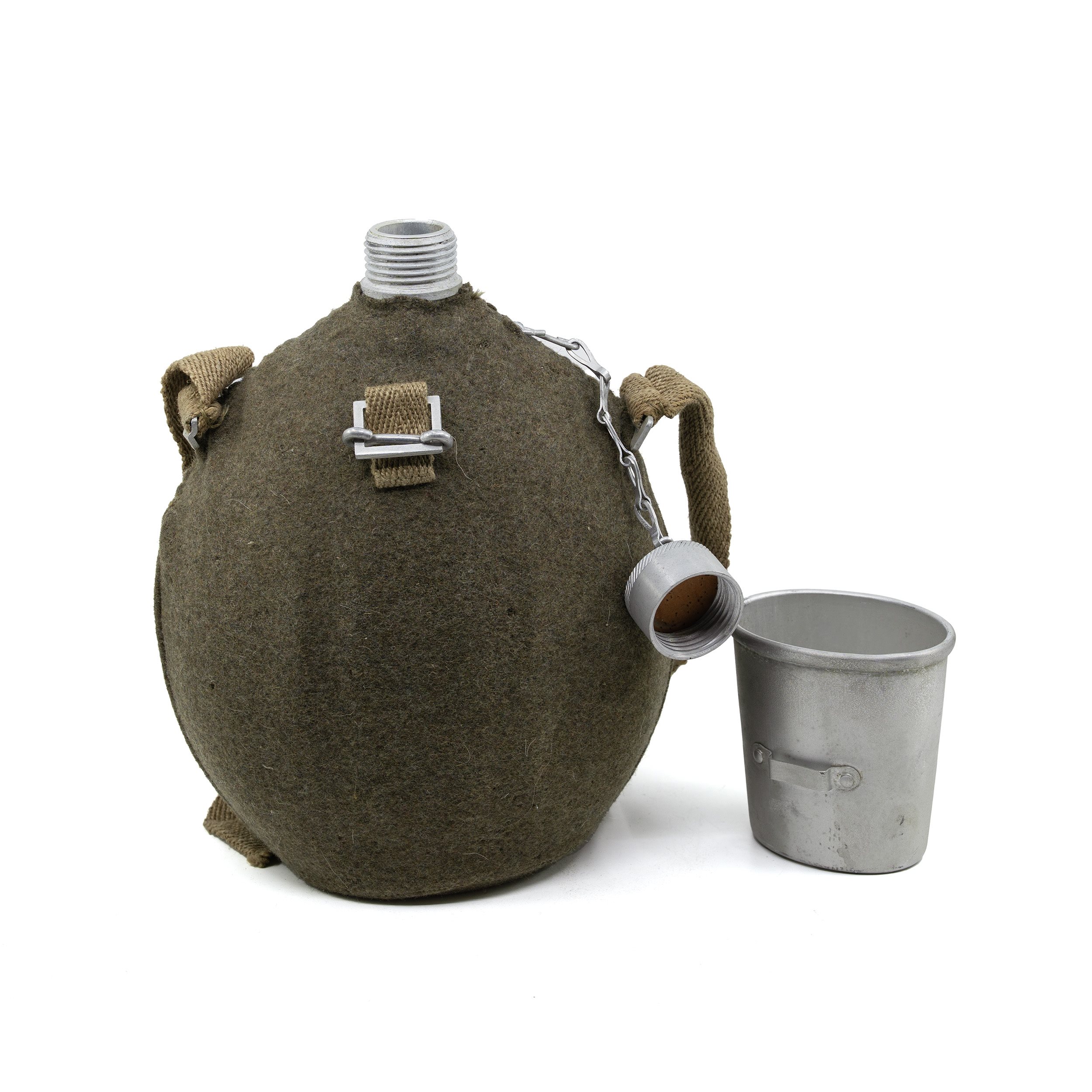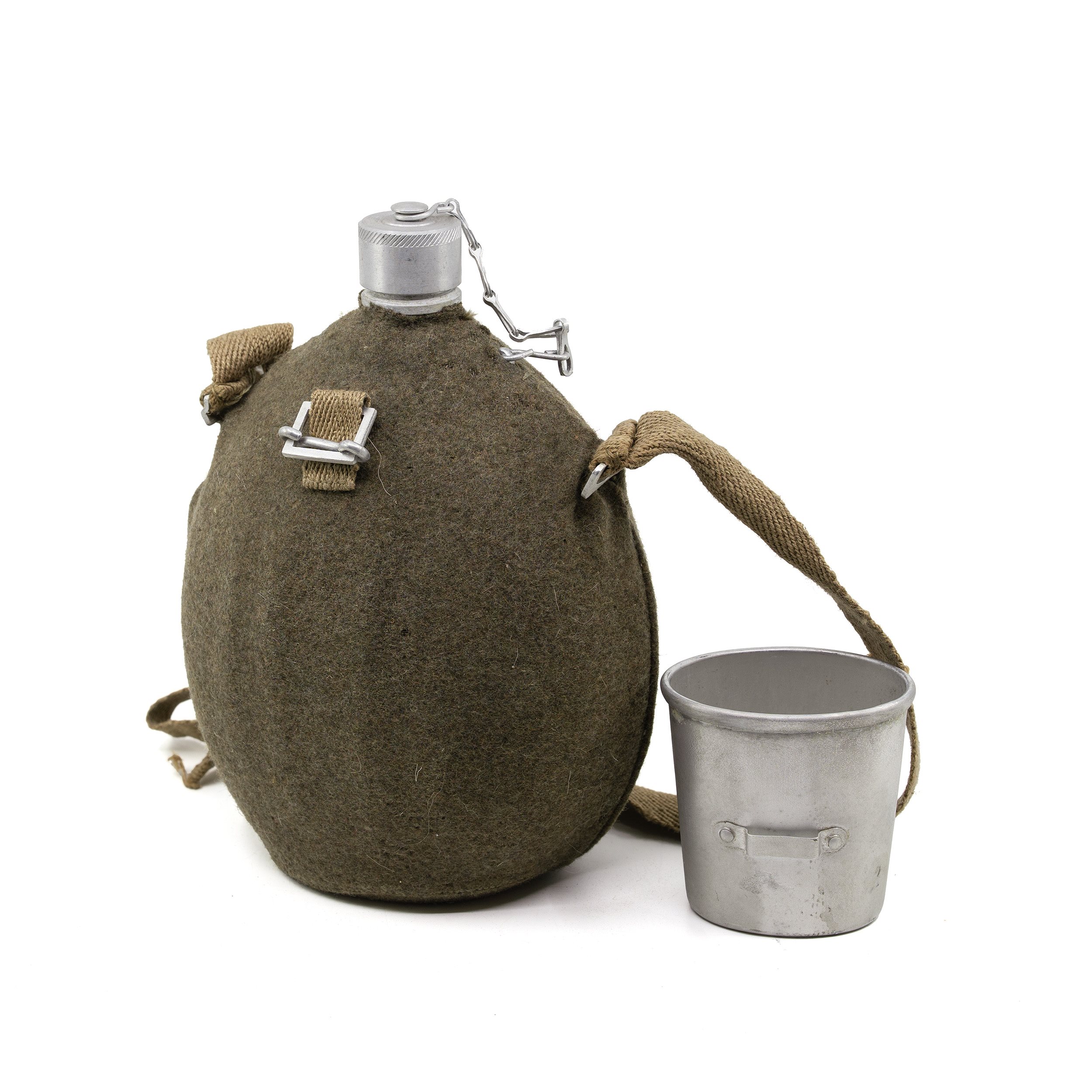 Alte Aluminiumflasche der italienischen Armee aus der Nachkriegszeit. Abmessungen: ca. 27 x 18 x 11 cm. Langfristig gelagerte Lagerware. Meistens neu oder leicht gebraucht, weist jedoch äußerlich Gebrauchsspuren aufgrund der Lagerung und Handhabung auf. Die Filzhülle kann von Motten befallen sein.
