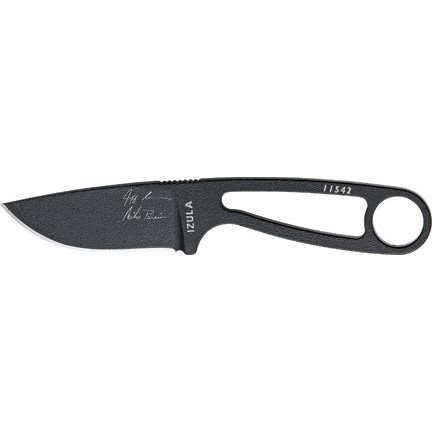 Das Izula ist ein leichtes und kompaktes Messer aus einem Stück 1095er Kohlenstoffstahl mit einer flachgeschliffenen Klinge und einer Härte von 55-57 HRC. Es ist mit einer matten Pulverbeschichtung vor Korrosion und unerwünschten Reflexionen geschützt. Im Gegensatz zur Standardversion trägt die Klinge die Unterschriften der Gründer der Firma ESEE – Jeff Randall und Mike Perrin. Der Skeletthandgriff mit Fingerring ermöglicht das Umwickeln mit einer Schnur, das Anbringen von zusätzlichen Griffschalen (nicht im Lieferumfang enthalten) oder das Befestigen an einem Karabiner. Das Messer wird mit einer selbstschließenden Kunststoffscheide mit abnehmbarer Platte und Gürtelclip geliefert. Das Messer kann horizontal oder vertikal, für Rechts- und Linkshänder gedreht getragen werden. Dank mehrerer Öffnungen in der Scheide kann es auch mit einem Karabiner an der Ausrüstung befestigt oder mit einer Schnur um den Hals getragen werden.