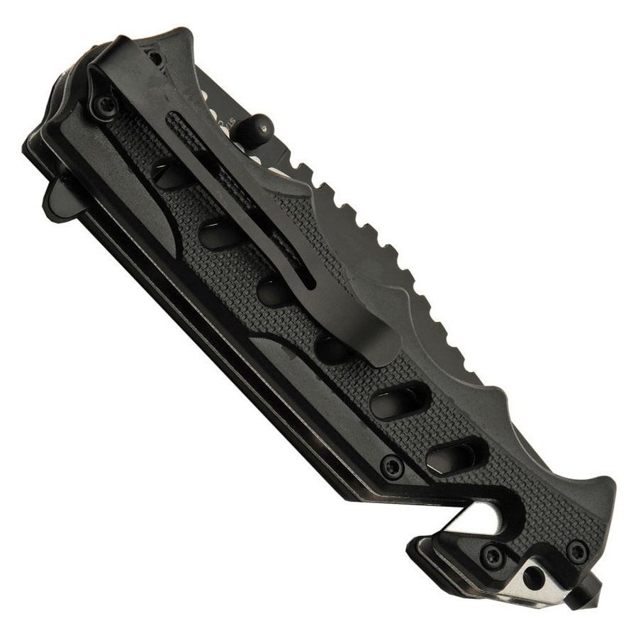 Komplett schwarzes Klappmesser mit Öffnungshilfe und mehreren Elementen aus Rettungsmessern. Weitere Informationen