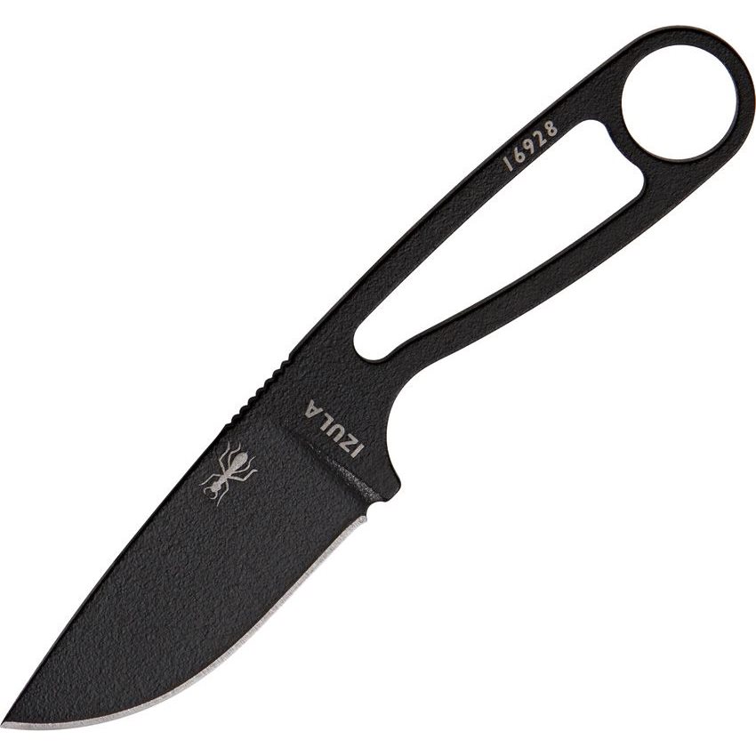 Izula ist ein leichtes und kompaktes Messer aus einem Stück 1095er Kohlenstoffstahl mit einer flachgeschliffenen Klinge mit einer Härte von 55-57 HRC. Es ist mit einer matten Pulverbeschichtung vor Korrosion und unerwünschten Reflexionen geschützt. Der Skeletthandgriff mit Fingerring ermöglicht das Umwickeln mit einer Schnur, das Anbringen von zusätzlichen Griffschalen (nicht im Lieferumfang enthalten) oder das Befestigen an einem Karabiner. Das Messer wird mit einer selbstschließenden Kunststoffscheide mit abnehmbarer Platte und Gürtelclip geliefert. Das Messer kann horizontal oder vertikal, für Rechts- und Linkshänder gedreht getragen werden. Dank mehrerer Öffnungen in der Scheide besteht auch die Möglichkeit, es mit einem Karabiner an der Ausrüstung zu befestigen oder eine Schnur zum Tragen um den Hals durchzuziehen.