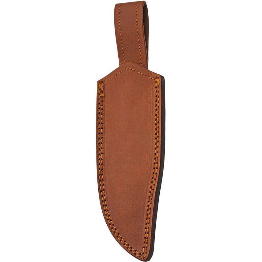 Ein Damast-Jagdmesser mit durchgehender Klinge und ungewöhnlichem Design, das mit einer Lederscheide geliefert wird. Weitere Informationen