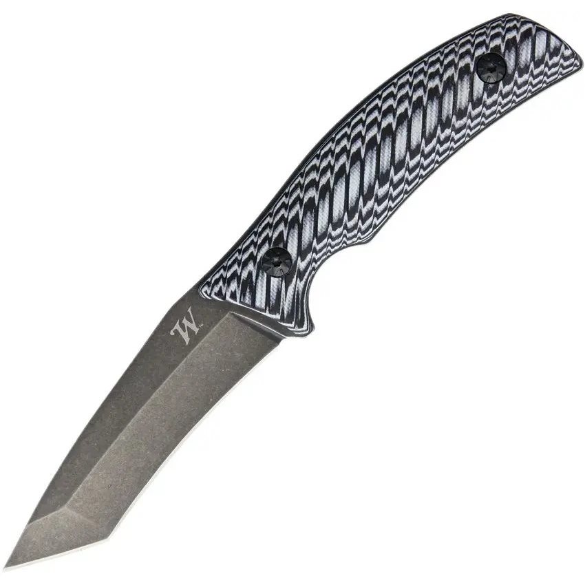 Tanto-Klinge aus rostfreiem Stahl mit schwarzem Stonewash-Finish. Griff aus schwarzer und grauer Micarta mit strukturierter Oberfläche. Full-Tang-Konstruktion. Schwarze Nylonscheide mit Gürtelschlaufe. Weitere Informationen