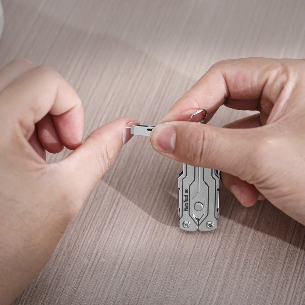Neben einer Schere enthält es auch eine Pinzette, eine Nagelfeile, einen Brillen-Schraubendreher, Flach- und Kreuzschraubendreher sowie einen Flaschenöffner. Diese durchdachte Kombination unterstützt Sie bei kleinen Wartungsarbeiten, schnellen Reparaturen und unerwarteten Situationen – alles in einem kompakten und zuverlässigen Werkzeug für Ihren Schlüsselbund. Werkzeuge: