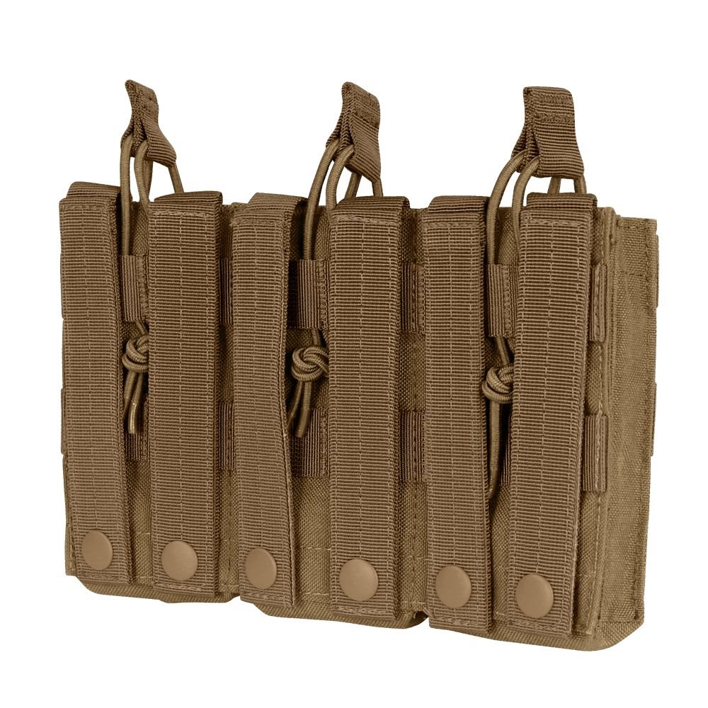 Dreifach-Magazintasche für 3 M16/M4-Magazine, zur Befestigung am MOLLE-System. Die Taschen sind oben offen, die Magazine werden nur durch ein elastisches, verstellbares Lanyard gesichert. Weitere Informationen