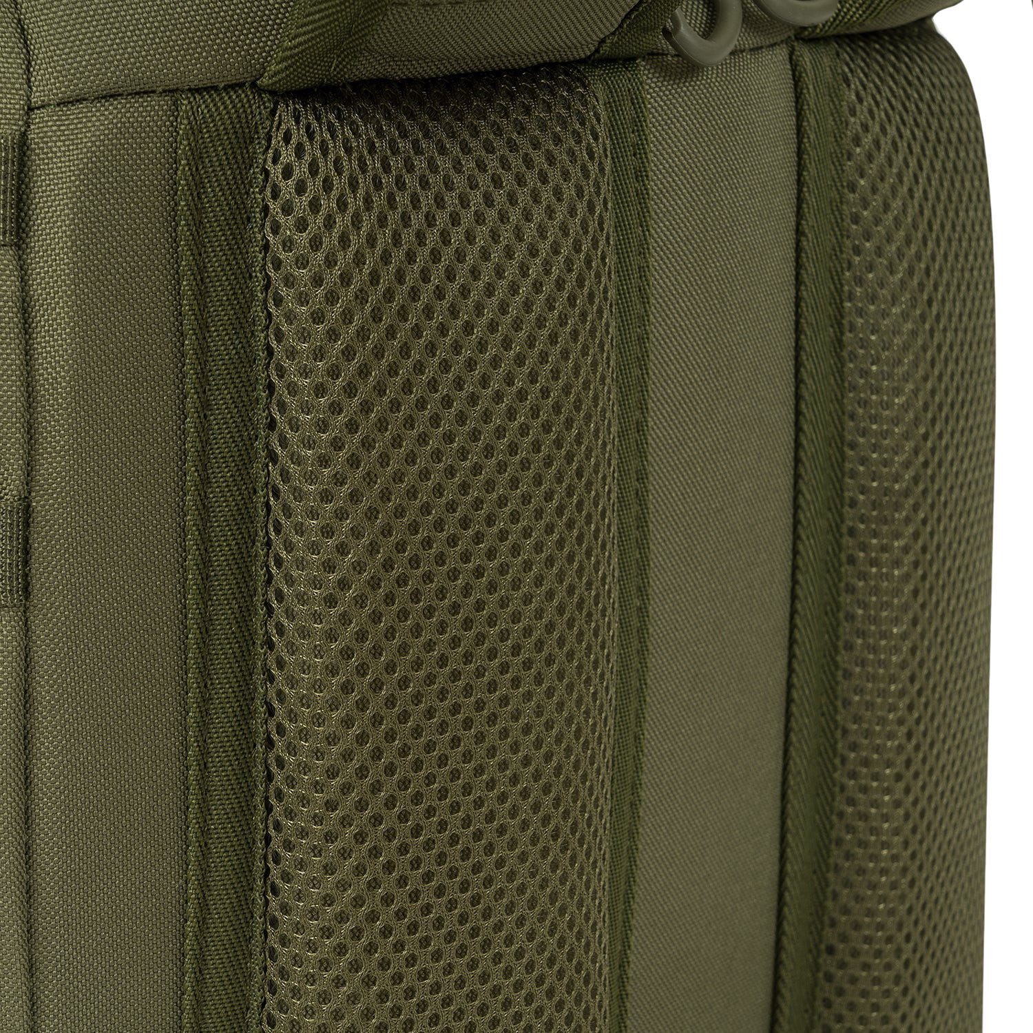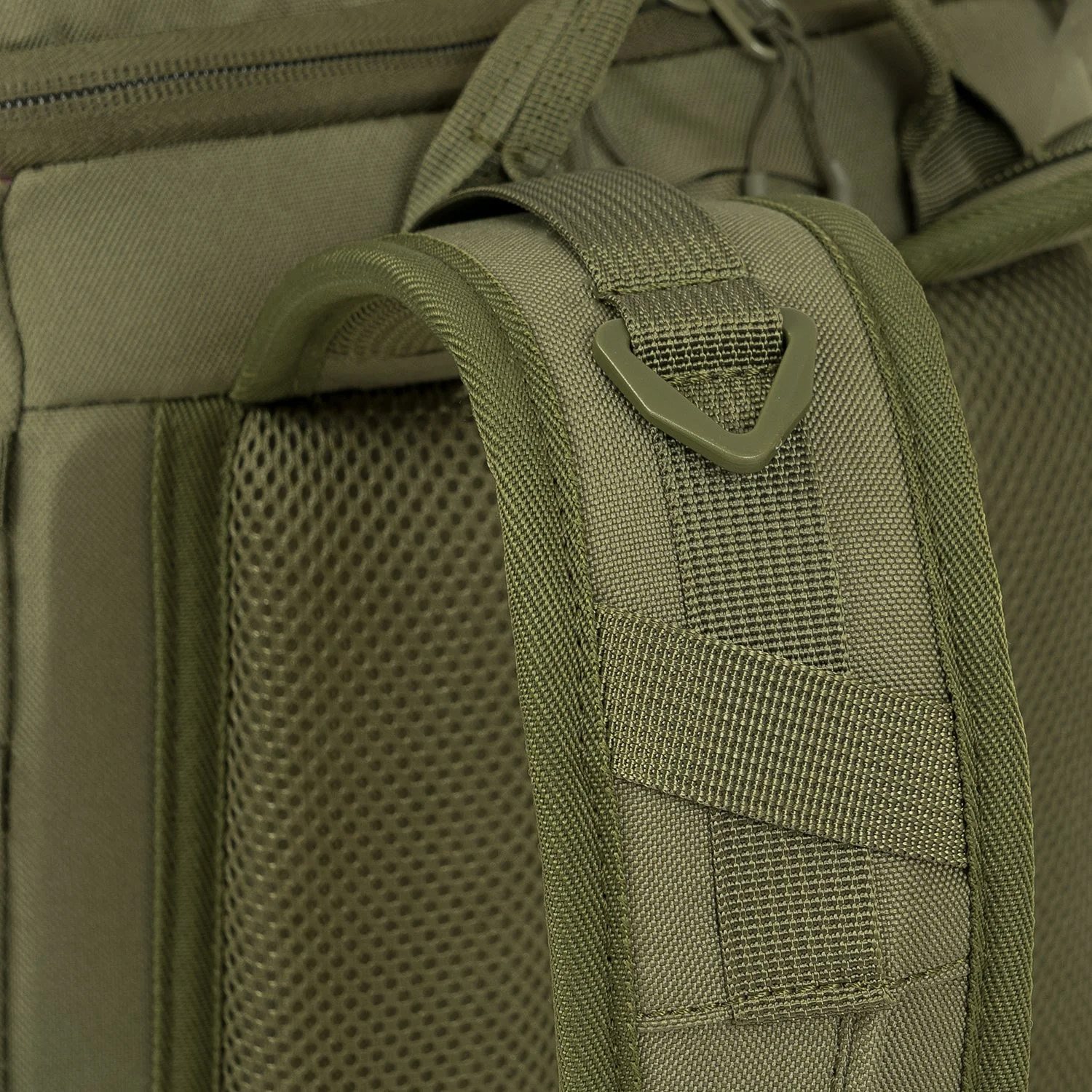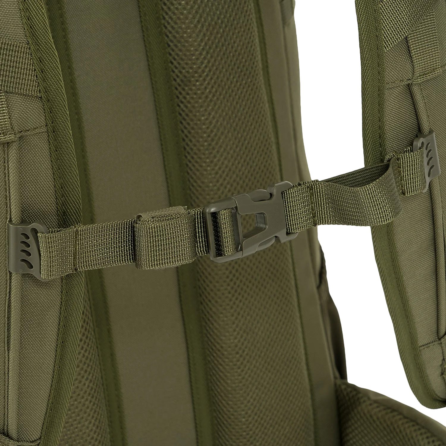 Der Rücken des Rucksacks ist reichlich mit 3D-Mesh gepolstert, dessen Form durch einen zentralen Kanal zur besseren Belüftung erhalten bleibt. Oben auf dem Rücken finden Sie einen klassischen Tragegriff aus Stoff. Die Tragegurte sind vollständig verstellbar, gepolstert, haben stabilisierende Gurte, Kunststoffdreiecke, Ösen zum Spannen der Schläuche des Trinkrucksacks und einen höhenverstellbaren elastischen Brustgurt, der mit einer Kunststoffschnalle geschlossen wird. Die Taille des Rucksacks ist teilweise gepolstert, wird mit einer Kunststoffschnalle geschlossen und hat kleinere Reißverschlusstaschen auf beiden Seiten. An den Seiten des Rucksacks finden Sie drei Reihen reduzierter MOLLE/PALS-Bindungen und elastische Taschen. Die Hauptklappe des Rucksacks verfügt über einen MOLLE/PALS-Bindestreifen, ein geräumiges Mittelfach, eine Deckeltasche und ein kleines VELCRO-Feld.