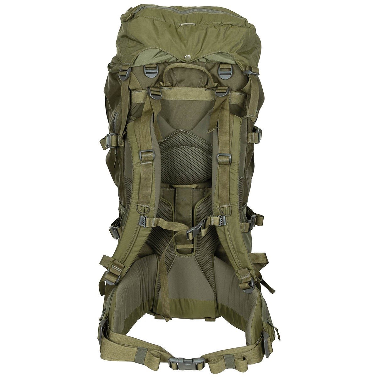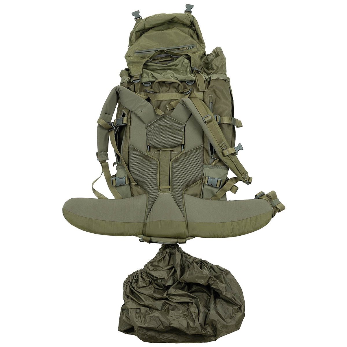 Zwei elastische Seitentaschen, jede mit einer Reißverschlusstasche darüber und zwei Kompressionsriemen