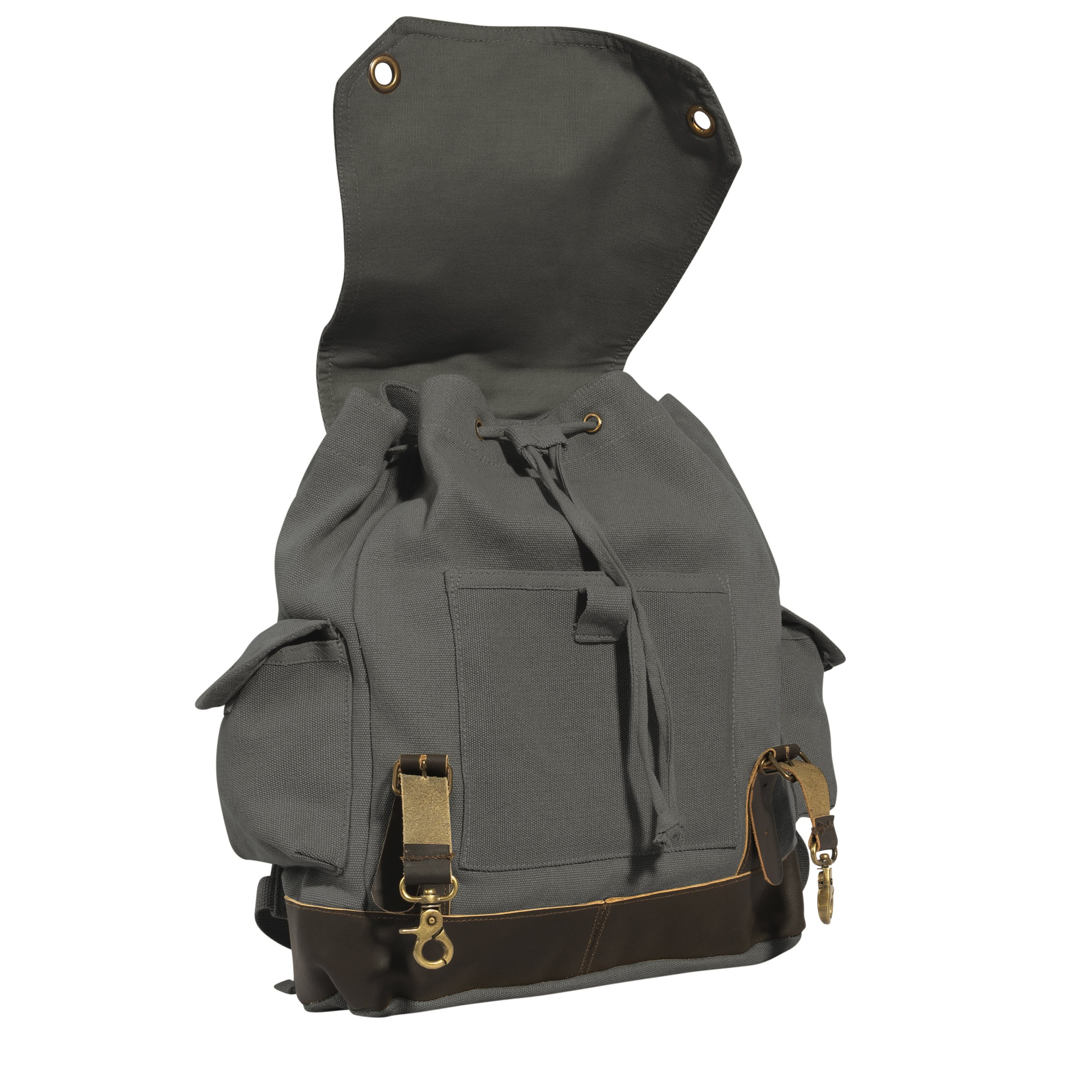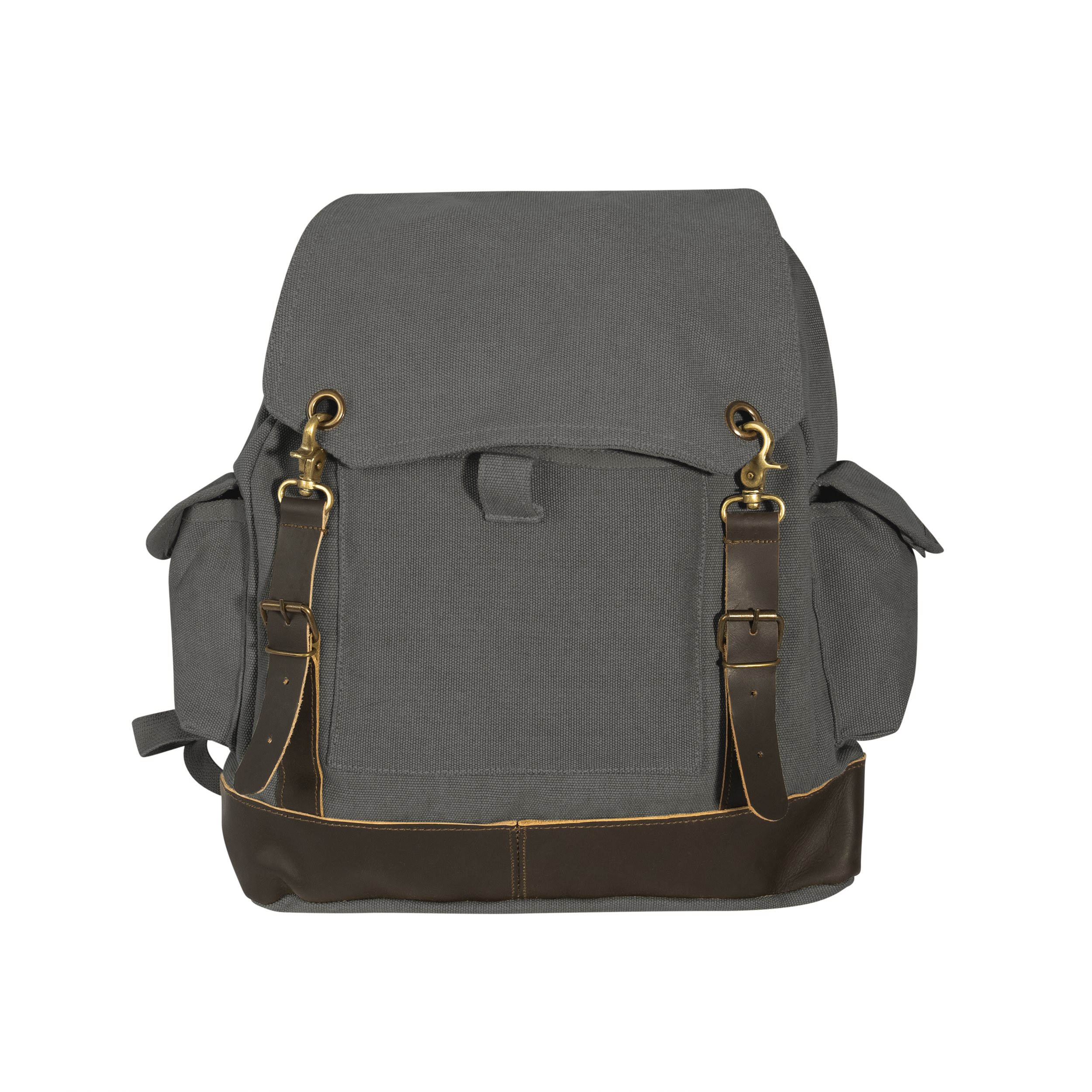Ein klassischer kleinerer Rucksack aus dickem Baumwoll-Canvas im Vintage-Design, komplett mit Leder- und Messingdetails. Ein stilvolles und praktisches Accessoire für jeden guten Wanderer.