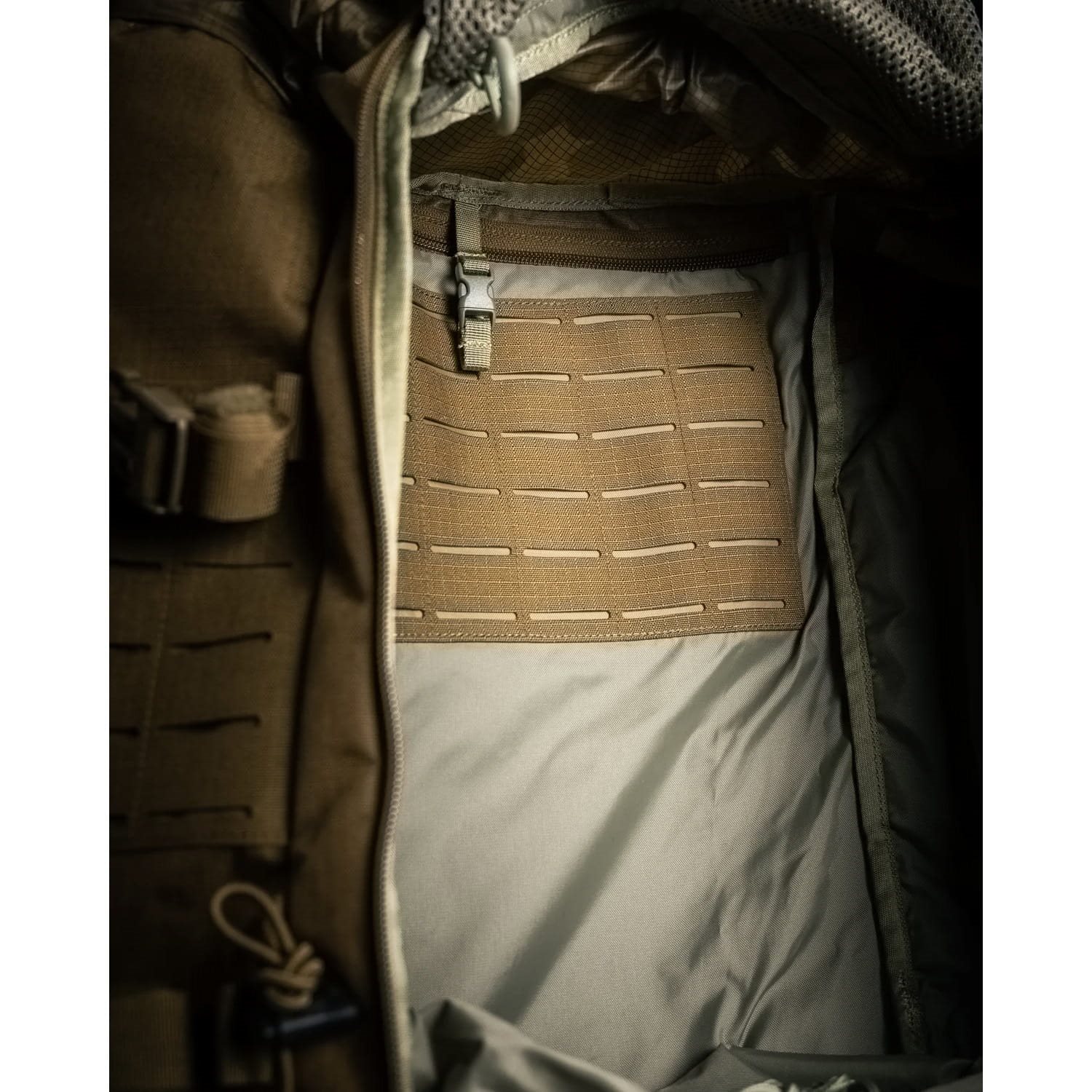 Zur einfachen Organisation verfügt der Rucksack an der Außenseite über zwei Fronttaschen, die über Zwei-Wege-Reißverschlüsse zugänglich sind, sowie über zwei Seitentaschen aus teilweise elastischem Material. Insgesamt vier seitliche, verstellbare Gurte können zur schnellen und einfachen Kompression des Rucksacks genutzt werden. Der Innenraum des Hauptfachs ist über den vorderen Eingang oder über den oberen Rollverschluss mit Fastex-Schnalle zugänglich. Das Hauptfach ist durch einen inneren Kragen in zwei Bereiche unterteilt; im Inneren finden Sie eine Schlaufe zur Befestigung eines Trinkbeutels sowie ein lasergeschnittenes Modul-Befestigungssystem zur Fixierung beispielsweise eines Funkgeräts.
