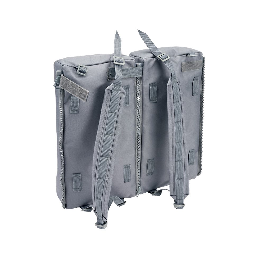Die Seitentaschen können abgenommen, miteinander verbunden und zu einem separaten Rucksack zusammengefügt werden. Ein MOLLE/PALS-System zum Befestigen kompatibler Taschen und Zubehörteile ist ebenfalls vorhanden. Der untere Teil des Rucksacks ist zusätzlich mit einem Reißverschluss ausgestattet, der ein einfaches Öffnen und schnellen Zugriff auf den Inhalt ermöglicht.