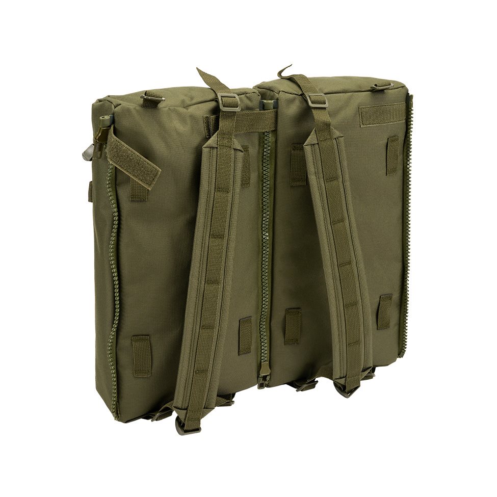 Die Seitentaschen können abgenommen, miteinander verbunden und zu einem separaten Rucksack zusammengefügt werden. Ein MOLLE/PALS-System zum Befestigen kompatibler Taschen und Zubehörteile ist ebenfalls vorhanden. Der untere Teil des Rucksacks ist zusätzlich mit einem Reißverschluss ausgestattet, der ein einfaches Öffnen und schnellen Zugriff auf den Inhalt ermöglicht.