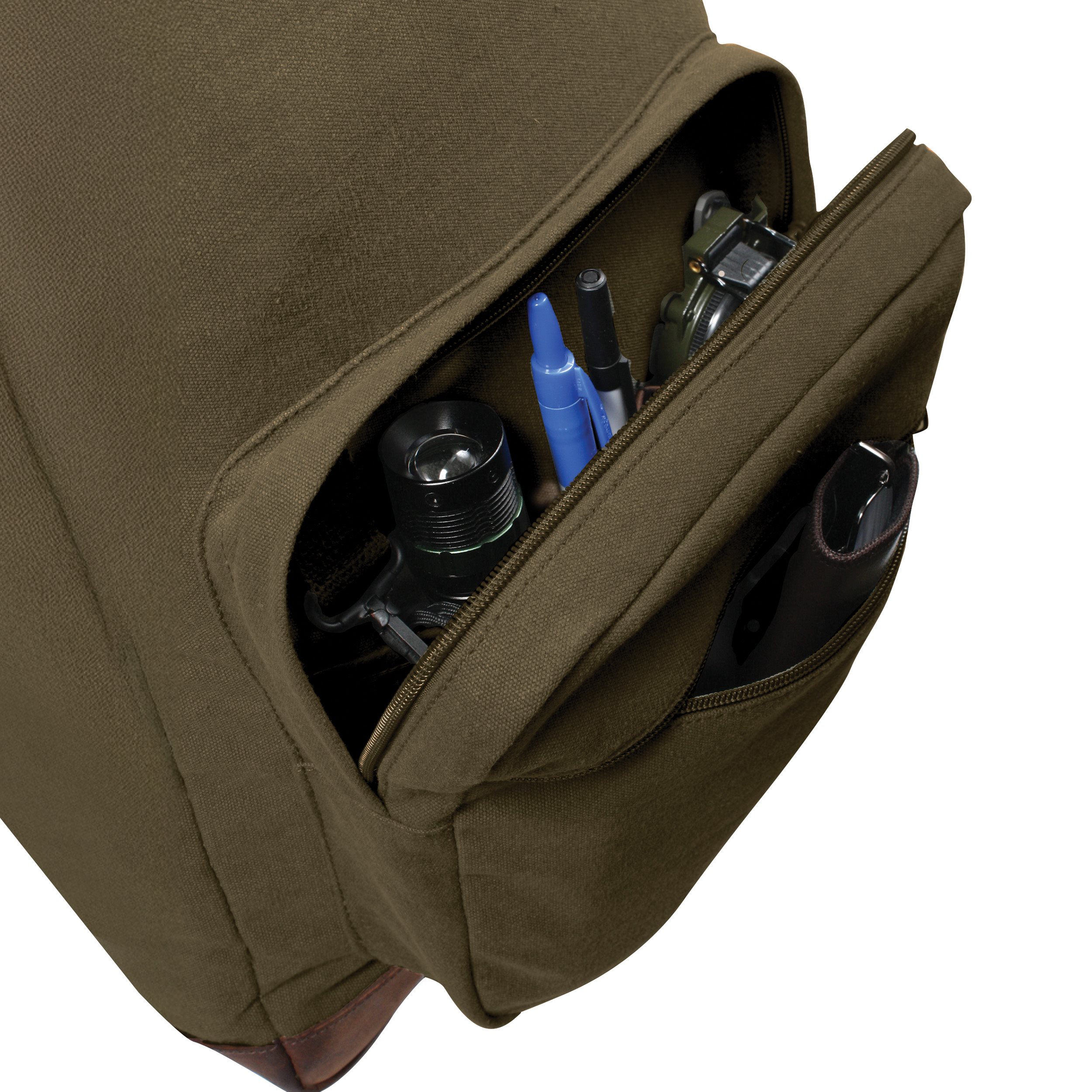 Kleinerer Rucksack im Vintage-Design. Er ist aus vorgewaschenem Baumwoll-Canvas und Lederzubehör (Boden, Griff) gefertigt. Im Hauptfach befindet sich ein gepolstertes Fach für einen Laptop und eine kleinere Tasche für ein Mobiltelefon. Die Außentasche mit Reißverschluss hat eine weitere kleinere Tasche auf der Oberseite. Auf der Oberseite des Rucksacks befindet sich ein verstecktes kleineres Fach mit einem Reißverschluss. Dank seiner Konstruktion ist der Rucksack sowohl für den zivilen Alltag in der Stadt als auch für Ausflüge aufs Land geeignet.