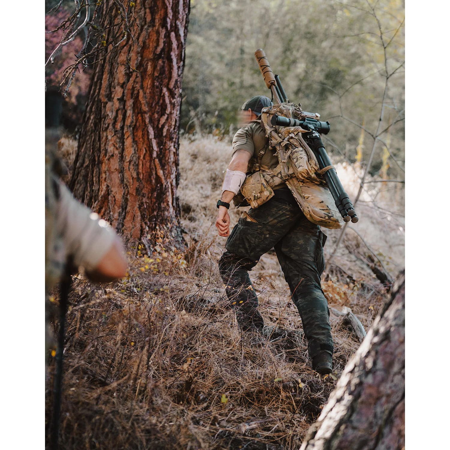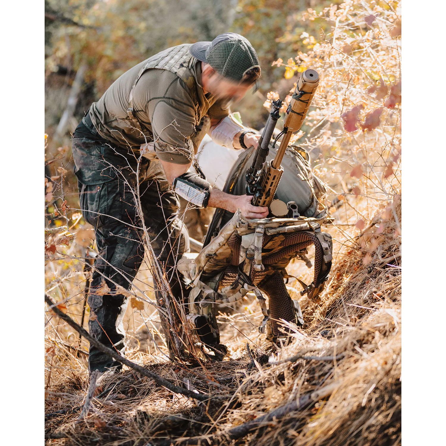 Die Schultergurte sind anatomisch geformt, stark gepolstert mit weichem 3D-Netzgewebe und verfügen über D-Ringe, einen elastischen Brustgurt mit Kunststoffschnalle und obere Stabilisierungsgurte, um den Rucksack optimal an den Körperschwerpunkt anzupassen. Ein wesentlicher Vorteil des Rucksacks ist die Möglichkeit, die Schultergurte je nach Körpergröße des Benutzers höhenverstellbar einzustellen. Der Rücken ist mit zwei Reihen 3D-Netzgewebe stark gepolstert. Der Hüftgurt ist massiv und sein mittleres Polster ist mit Silikonelementen überzogen, um ein Verrutschen des Rucksacks bei dynamischen Bewegungen zu verhindern. Direkt hinter der Rahmenkonstruktion befindet sich eine mit Reißverschlüssen zu öffnende RAID™-Tasche für eine lange Waffe.