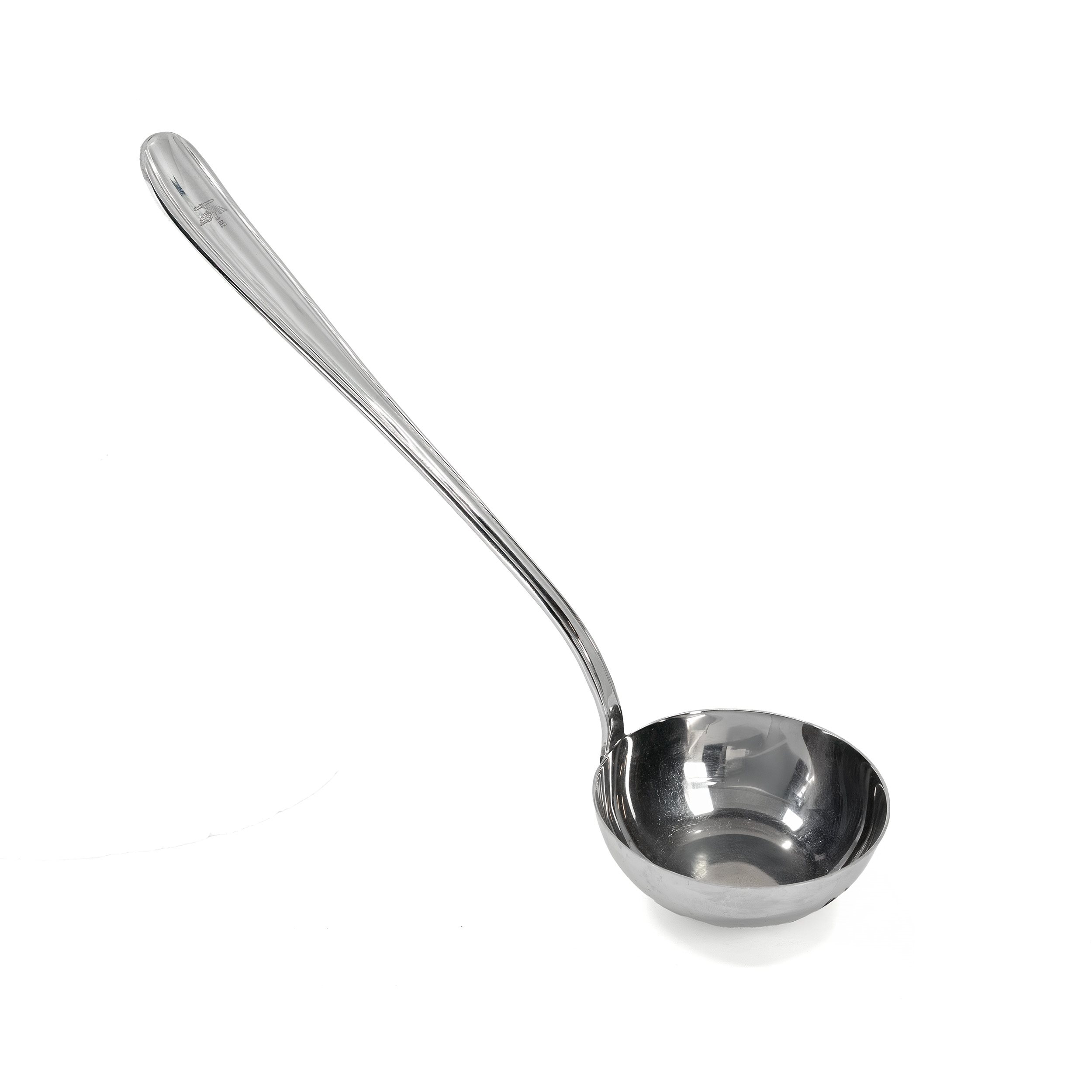 Inoxriv-Schöpflöffel mit glänzender Oberfläche. Hervorragend geformt und ausgewogen, angenehm schwer.