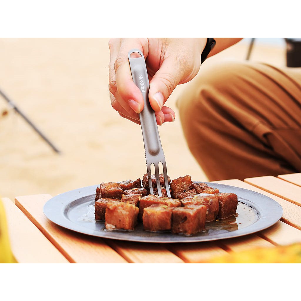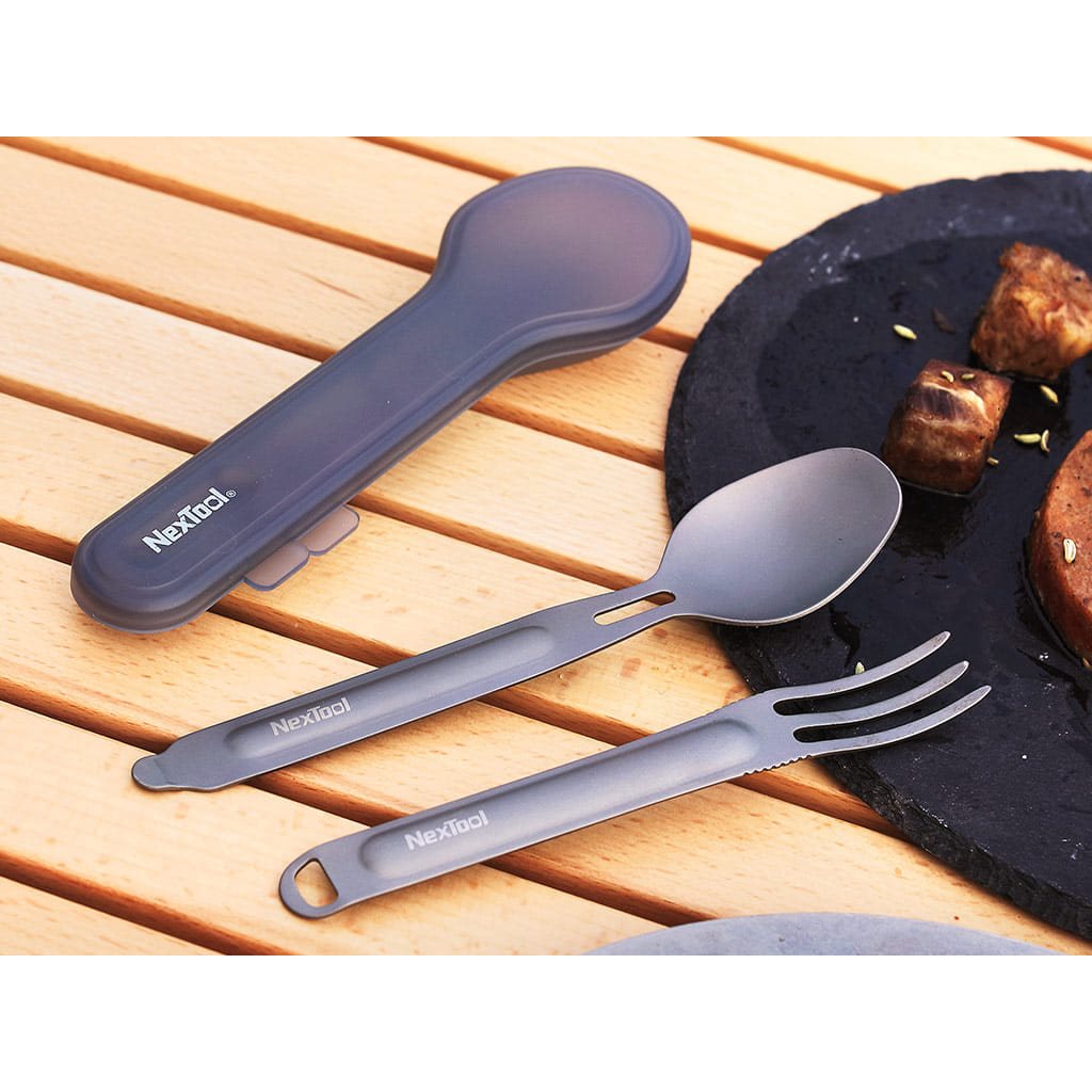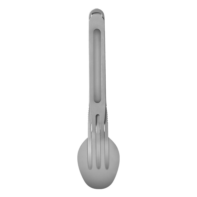 Kompaktes zweiteiliges Titanbesteck, das sich leicht zusammenlegen lässt. Weitere Informationen